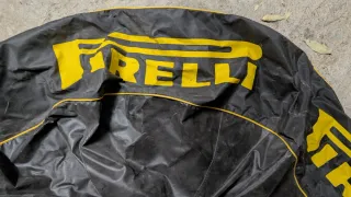 Funda protectora de la marca Pirelli, diseñada para ruedas de camión. Es de color negro con detalles en amarillo. - Material resistente. - Logo Pirelli visible.