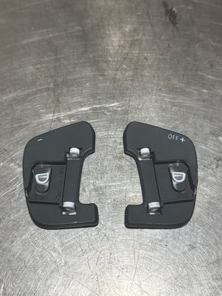 Levas de volante para Golf 7 con cambio DSG. - Leva izquierda con símbolo -. - Leva derecha con símbolos OFF y +. - Mecanismo de fijación blanco visible.