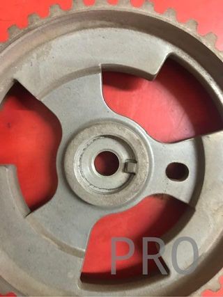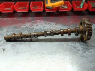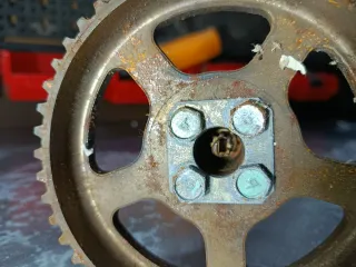 Árbol de levas para Nissan 200SX modelo CA18DET. Pieza de metal con engranaje y tornillería visible. - Engranaje con dientes. - Fijado con tornillos. -oxido superficial que pasándole un estropajo sale