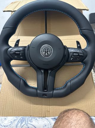 Volante deportivo para BMW M. - Diseño M con costuras azules. - Material de cuero perforado. - Incluye levas y botones.