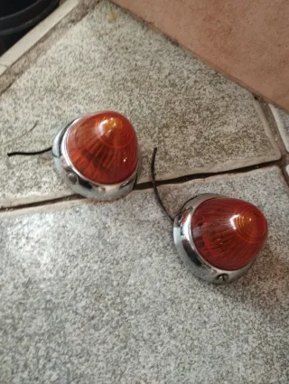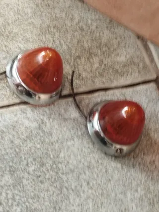 Juego de pilotos naranja con base de 7 CMS. cromada, uno de ellos presenta una leve deformación el cristal. Muy buen estado, parecen nuevos sin señal de haber estado instalados. Modelo típico de coches ingles años 60/70. Adaptable a muchos más. La pareja.