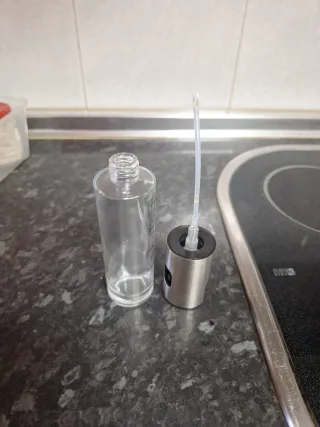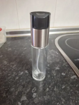 Botella pulverizador para aceite, ideal para usar en la cocina. Fabricada en cristal y acero inoxidable. - Diseño elegante y funcional. - Tubo dosificador para una pulverización uniforme.