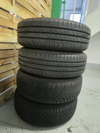 Juego de llantas con neumáticos para vehículos Citroën y Peugeot. Listas para instalar. Son dos GoodYear Efficient Grip y dos Falken AllSeason 175/65 R14 4x108 - Compatibles con varios modelos de Citroën. - Compatibles con varios modelos de Peugeot.