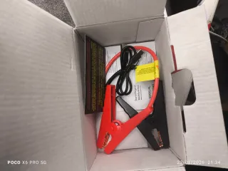 Arrancador de coche portátil de color rojo. - Puertos USB y USB-C. - Incluye linterna LED.