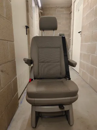 Asiento de furgoneta Volkswagen. T5 y T6. Transporter, california, multivan, caravelle.. - Tapicería en tela gris y negra. - Reposacabezas integrado. - Cinturón de seguridad de 3 puntos. - Reposabrazos abatible. - Isofix - Respaldo abatible. -Cajón inferior para carga. -Asiento giratorio.