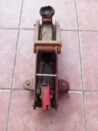 Gato elevador hidráulico de color rojo, ideal para levantar vehículos. - Mecanismo de elevación. - Ruedas para facilitar el desplazamiento. - Asa para operación.
