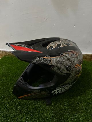 Casco de motocross con un diseño llamativo y detallado. - Color base negro. - Gráficos tribales en tonos plateados y anaranjados. - Visera aerodinámica. Usado solo el verano pasado después se dejo de usar.