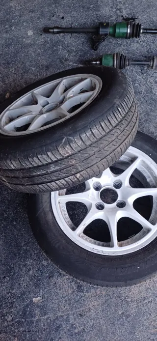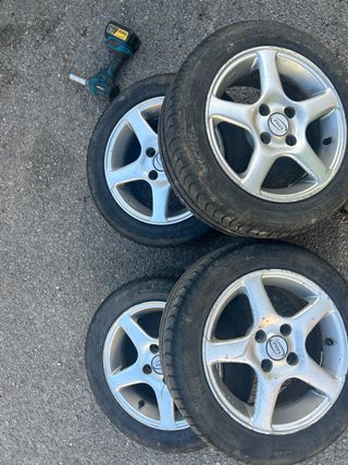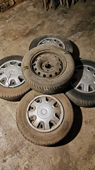 Son de Hyundai getz manzana 4x100 Neumáticos 165/65/14 No sé si los neumáticos valen creo que no Todos son de marcas distintas por eso los cambie no pasaba itv Vienen con tapacubos 50€ los 4