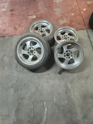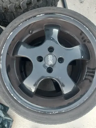 Juego de llantas de 17 pulgadas con un patrón de pernos de 4x100. - Incluye neumáticos. - Dos de los neumáticos necesitan ser reemplazados.