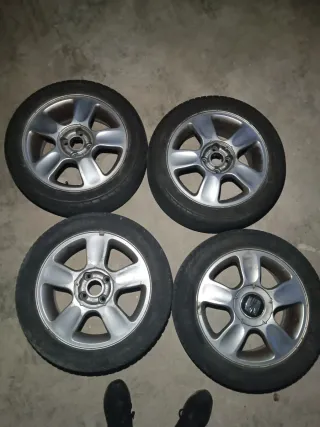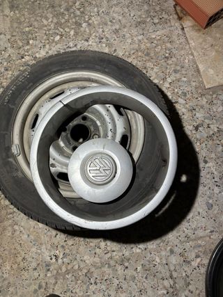llantas melber en 15” buje 57.1 vw, seat 4x100, los neumáticos aún le quedan para el testigo pero están agrietados por los laterales se pueden utilizar todavía, lo suyo sería cambiarlos