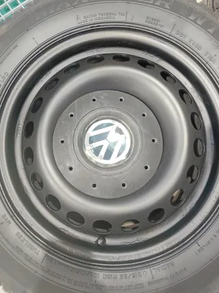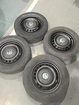 Juego de 4 llantas de acero para Volkswagen T5. Listas para montar. - Llantas de acero originales. - Diseño con múltiples orificios. - Tapas centrales con logo Volkswagen. Los neumáticos están para cambiar y tiene uno de los tapones con los soportes de los tornillos rotos.el precio es para todas cuatro.