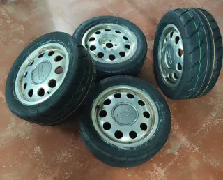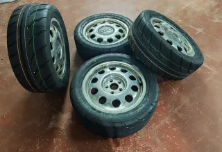 Juego de 4 llantas de aleación con neumáticos nuevos sin estrenar Equilibradas las 4 llantas. Neumáticos nuevos. 2 semi slick Toyo 2 semi slick Nankang Llantas 15 pulgadas , Ibiza , león , a3 , A4, felicia , octavia, golf 4, Passat , Bora etc .. Tornillería 5x100. Perfectas para lanzadas , circuito o calle ... Etc NO CAMBIO Palabras gancho Drag, matilleras, portuguesas, ligeras