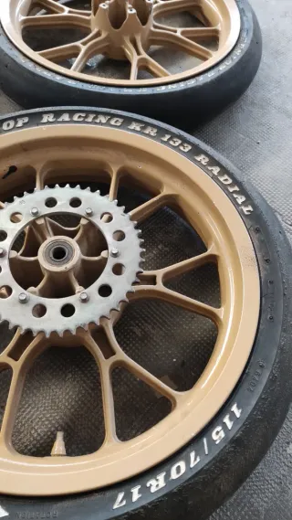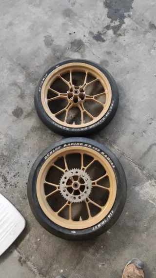 Juego de dos ruedas para Yamaha YZF-125-R. - Llantas pintadas doradas. - Color original azul (si se decapan quedarian en color azul original) - Incluye piñón de 46 dientes - Llantas de aleación de 10 palos (estilo deportivo) - Con anclaje para disco de 6 tornillos Neumáticos Dunlop Racing kr 133 radial slick: Delantera: Dunlop Racing 120/70 ZR17 Trasera: Dunlop Racing 160/60 ZR17 Los neumáticos tienen poco uso pero son viejos Referencia J17xMT3.50 DOT ZCV GRAZZEY J17xMT275 DOT ZCV GRAZZEY Válidas oaramuchos modelos como la YBR 125-250 Ideal para algun proyecto de restauración o custom