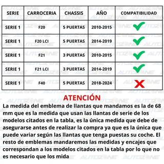Ref. BPCK-519 Material: ABS Compatibilidad: Compruebe la 2nda imagen El pack incluye: X1 Emblema capó X1 Emblema maletero X1 Emblema volante X4 Emblemas para llantas X2 Tacos de sujeción para capó X1 Herramienta extracción Si no está seguro de la compatibilidad de esta referencia facilítenos los 7 últimos dígitos del número de bastidor de su coche y se lo confirmaremos, el único emblema que deberá de confirmar es el de llantas. 21% de IVA incluido en el precio, podemos emitir factura. NO negociable, no somos particulares IGNORAR: BMW 120d, BMW 130i, BMW M135, BMW M140, BMW M1, BMW M, BMW MOTORSPORT, BMW G POWER