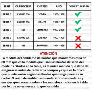 Ref. BPCK-528 Material: ABS Compatibilidad: Compruebe la 2nda imagen El pack incluye: X1 Emblema capó X1 Emblema maletero X1 Emblema volante X4 Emblemas para llantas X1 Herramienta extracción X2 Tacos de sujeción maletero X2 Tacos sujeción capó Si no está seguro de la compatibilidad de esta referencia facilítenos los 7 últimos dígitos del número de bastidor de su coche y se lo confirmaremos, el único emblema que deberá de confirmar es el de llantas. 21% de IVA incluido en el precio, podemos emitir factura. NO negociable, no somos particulares IGNORAR: BMW M3, BMW E36, BMW 320i, BMW VANOS, BMW 325i, BMW 330i, BMW M3 E36
