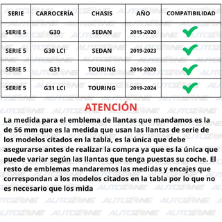 Ref. BPCK-539 Material: ABS Compatibilidad: Compruebe la 2nda imagen El pack incluye: X1 Emblema capó X1 Emblema maletero X1 Emblema volante X4 Emblemas para llantas X1 Herramienta extracción X2 Tacos de sujeción maletero X2 Tacos de sujeción capó X1 Adhesivo doble cara Si no está seguro de la compatibilidad de esta referencia facilítenos los 7 últimos dígitos del número de bastidor de su coche y se lo confirmaremos, el único emblema que deberá de confirmar es el de llantas. 21% de IVA incluido en el precio, podemos emitir factura. NO negociable, no somos particulares IGNORAR: BMW 520, BMW 530, BMW 550, BMW 540, BMW M5