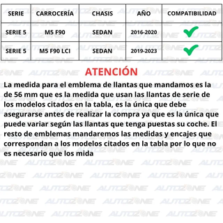 Ref. BPCK-540 Material: ABS Compatibilidad: Compruebe la 2nda imagen El pack incluye: X1 Emblema capó X1 Emblema maletero X1 Emblema volante X4 Emblemas para llantas X1 Herramienta extracción X2 Tacos de sujeción maletero X2 Tacos de sujeción capó X1 Adhesivo doble cara Si no está seguro de la compatibilidad de esta referencia facilítenos los 7 últimos dígitos del número de bastidor de su coche y se lo confirmaremos, el único emblema que deberá de confirmar es el de llantas. 21% de IVA incluido en el precio, podemos emitir factura. NO negociable, no somos particulares IGNORAR: BMW M5, BMW M5 V10, BMW M5 CS, BMW M5 COMP.