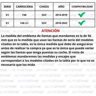 Ref. BPCK-552 Material: ABS Compatibilidad: Compruebe la 2nda imagen El pack incluye: X1 Emblema capó X1 Emblema maletero X1 Emblema volante X4 Emblemas para llantas X1 Herramienta extracción X2 Tacos sujeción para maletero X1 Adhesivo doble cara Si no está seguro de la compatibilidad de esta referencia facilítenos los 7 últimos dígitos del número de bastidor de su coche y se lo confirmaremos, el único emblema que deberá de confirmar es el de llantas. 21% de IVA incluido en el precio, podemos emitir factura. NO negociable, no somos particulares IGNORAR: BMW X2, BMW X2 18i, BMW X2 M35iX, BMW X2 20dX