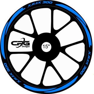 Lote de pegatinas para moto Yamaha XMAX como las de las fotos. Un kit de logos y otro para las dos llantas. Todo en color azul oscuro mate como el de la foto. Medidas de llantas en 14 y 15 pulgadas.