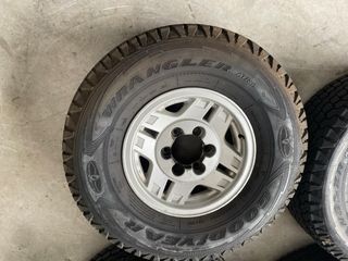 Se venden 5 llantas para Toyota HDJ 80 de 15 pulgadas. Se incluyen 5 neumáticos adicionales de regalo. - Llantas Goodyear Wrangler AT/SA. - Tamaño: 265/70R15. - Diseño AT/SA para tracción en todo terreno.
