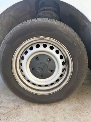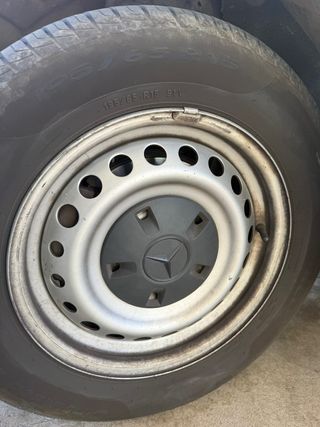 Juego de llantas de acero para Mercedes Citan. -Neumaticos con 3000km - Tamaño: 15 pulgadas. - Diseño con múltiples orificios. - Tapacubos central con logo Mercedes-Benz.