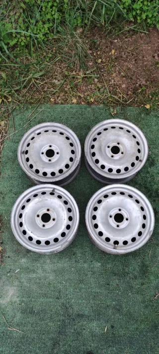 Juego de llantas de acero de 15 pulgadas - Diseño de 4 agujeros. - Diámetro de 15 pulgadas. Montadas en Renault clio III Sin neumáticos, válidas para más modelos. OFERTA 50€ LAS 4 UNIDADES GRACIAS Y UN SALUDO