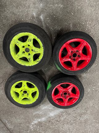 Juego de 4 llantas de 15 pulgadas con un patrón de pernos de 4x108. 2 con semislick al 20% 2 con hankook s1 evo al 50% Están para pintar. Color gris 195/50/15 las 4
