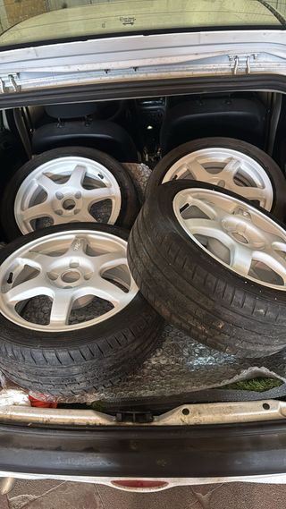Juego de llantas de aleación para Mazda MX5 NC. Diseño deportivo de 5 radios. Se aceptan cambios. - Llantas de 16 pulgadas. - Neumático 205/50R16 87W. - Marca de neumático: Nova-Force. - Tornillería 5x114,3 - Neumaticos en buen estado, uno pinchado