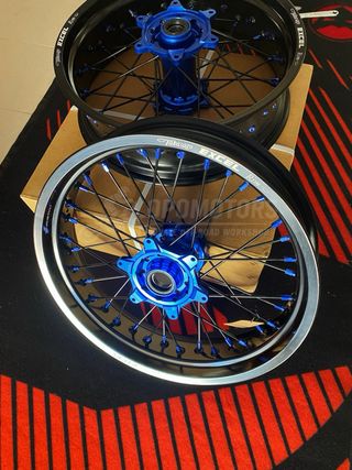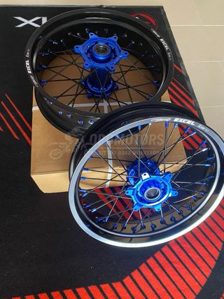 Juego de llantas Supermoto 17 pulgadas, ideales para convertir tu moto de enduro en supermotard y disfrutar al máximo en asfalto. KTM , Husqvarna, Gasgas, Sherco, Yamaha, Rieju, Beta, Honda ✅ Medidas: • Delantera 17x3,5 • Trasera 17x5,0 ✅ Características: • Aros negros de alta resistencia • Bujes CNC anodizados en azul • Radios reforzados con cabecillas azules • Montadas y centradas, listas para instalar ✅ Uso: Supermoto / asfalto / street / tandas Compatibles con neumáticos habituales 120/70 delante y 160/60 detrás, ofreciendo gran estabilidad, agarre y precisión en curva. 📦 Envío disponible 📍 Posible entrega en mano