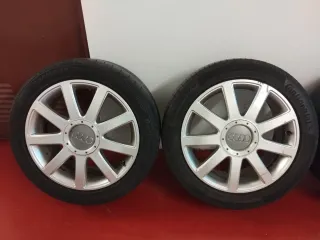Juego de 4 llantas en 17 pulgadas originales de Audi A4 S-line. En buen estado, presentan algun roce típico del uso. Preferiblemente entrega en persona, se hacen envíos si lo gestiona el comprador. Los neumáticos son 235/45 están para cambiar. Tornillería 5x112. ¡Precio no negociable!