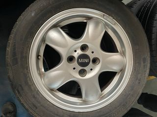 Juego de llantas de aleación para Mini. - Tamaño de 15 pulgadas. - Diseño de 5 radios. - Logo de Mini en el centro.