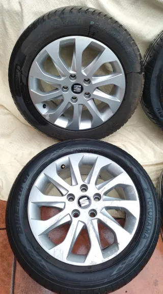 Juego de cuatro llantas de 16 pulgadas con neumáticos. - 205/55 R16 91V - 2 x Kormoran Road Performance -- 90 % vida, finales 2024 - 2 x Yokohama Blue Earth -- 50 % vida, finales 2022 - Algunos arañazos del uso. - Una de las llantas sí tiene más señales pero sin pellizcos en el aluminio. - Tampoco tienen llantazos. - Válido para Seat, Audi, VW, León,...