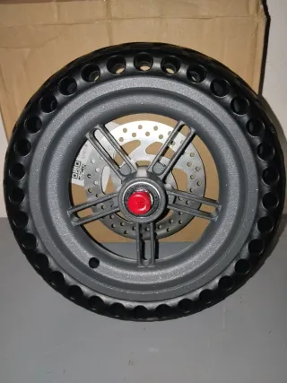 Rueda trasera para patinete con disco de freno. - Llanta de aluminio. - Neumático con diseño de agujeros. - Disco de freno metálico.