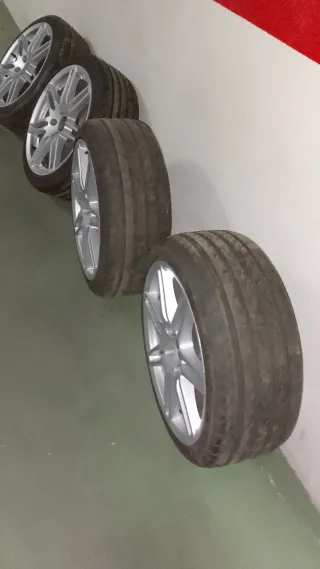 Juego de 4 Llantas de 19 pulgadas Modelo Katana en 19" Busco cambio por llantas y neumáticos en 18 " las delanteras Tienen 3 meses la traseras en buen estado, solo lo uso fines de semana Tienen 2 pequeñas rozaduras de aparcamiento, se ven en las fotos las otras 2 están impecables - Diseño deportivo. - Acabado en negro y plata.