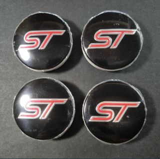 Juego de 4 tapabujes para llantas Ford con el logo ST de 54mm - Diseño deportivo ST. - Color negro brillante con detalles en rojo y plateado.