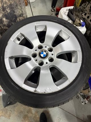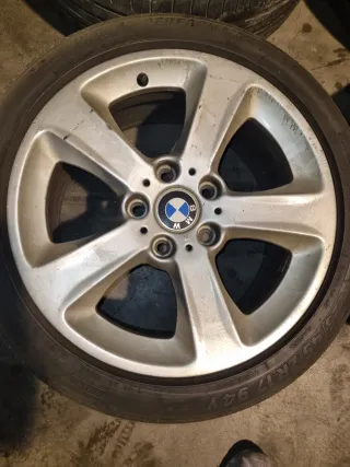 Juego de llantas BMW. - Diseño deportivo de 5 radios dobles. - Acabado plateado. - Centro con logo BMW. 17 pulgadas montadas en bmw 330d e90 neumaticos en buen estado
