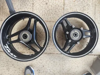 Juego de llantas para Yamaha Tmax 500. Modelo 208-2011 ABS - Diseño deportivo en color negro. - Detalle de franja blanca en el aro. - Incluye pegatinas 'Tmax' en una de las llantas.