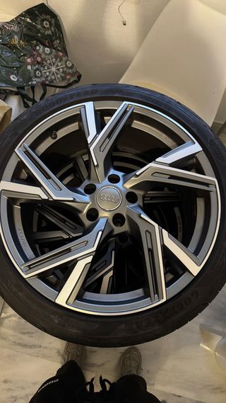 Juego de llantas estilo RS6 C8 de 19 pulgadas. 8.5X19 5X112 ET25 66.6 - Diseño deportivo y elegante. - Acabado en gris y detalles pulidos. - Compatibles con varios modelos Audi. Dos de ellas necesitan reparación por golpe en bache, en cuanto a arañazos lo único que tiene es lo que se pueden ver en las fotos, los neumáticos están prácticamente agotados también, por eso el precio.