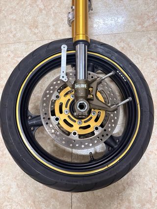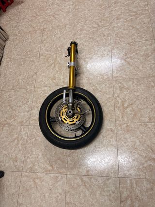 Horquilla delantera completa para Kawasaki Ninja ZX6R de los años 2003 y 2004. Incluye la rueda delantera con disco de freno. - 2 Horquillas OHLINS dorada. - Llanta delantera con aro dorado. - 2 Discos de freno perforado. -rueda delantera Michelin Pilot 120/70 ZR 17. -Tija completa