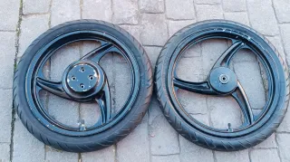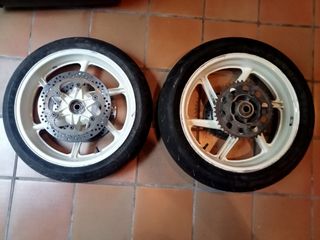 Vendo un juego de llantas completas de Honda CBR 600 F2. Incluyo los tres discos de freno y la corona trasera completa. Puedo añadir ambos ejes con sus casquillos y sinfín del velocímetro por 30€ adicionales. Los neumáticos son unos michelin power race que aún tienen dibujo pero que recomiendo cambiar por seguridad. Pintura saltada en un par de lugares concretos, ver fotos de detalle. Precio no negociable.
