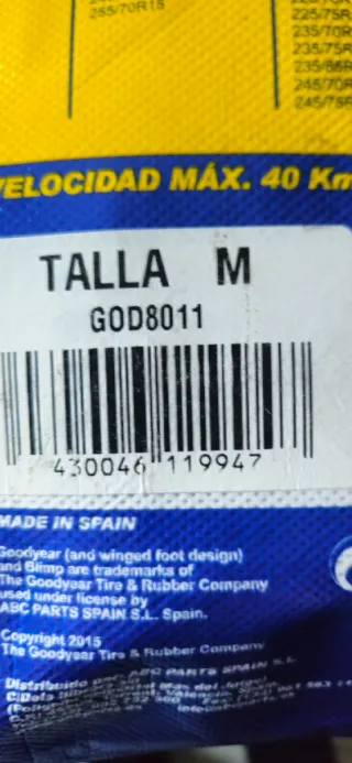 Cadenas textiles para la nieve de la marca Goodyear. - Modelo: Ultra Grip. - Material: 100% textil. - Incluye: 2 unidades. - Talla M - Rápido y fácil de instalar. - Silenciosas y sin vibraciones. - Compatible con varias medidas de llantas.
