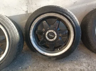 Se venden 4 llantas de coche usadas. Están algo desgastadas por el uso. - Llantas de color negro. - Se venden en el estado que se muestran en las fotos. dos con neumatico i dos sin ((225 40 R18)) tornilleria 5x100