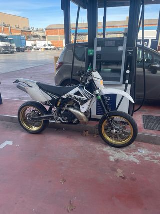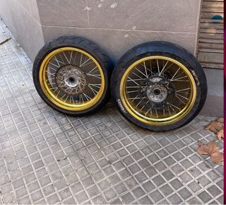 llantas sm para moto de enduro/cross caben perfectas en la gas gas ec y supongo que en las demas adaptando alguna cosa ( ktm, husqvarna , yamaha , kawasaki, beta, sherco , suzuki...) se entregan con neumaticos (el trasero esta gastado) ,corona y discos de freno que encajan a la perfeccion con las pinzas de serie de la gas gas ec 250 2t La llanta trasera tiene algunas rascadas