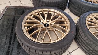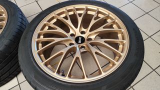 Se venden cuatro llantas de 19 pulgadas . Están en muy buen estado y montadas con neumáticos. Llanta forjada y poco peso. Tiene unos 2.000km de uso. Se vende por cambio de medida. - 19 x 8.5 / 245 40 19 ET 35 9 kg - 19 x 9.5 / 265 40 19 ET 38 9.4 kg - 5x114.3 - buje rueda 73.1mm - Tamaño: 19 pulgadas - Color: Dorado - Incluyen neumáticos Hankook Ventus S1 Evo3 Valido para coches con 5x 114.3, nissan z, 350z, 350z, Silvia, 200sx, mazda rx8, mps, 3000gt,eclipse, lancero evo, Subaru impresa, wrx, Sri, supra , mr2, celica, ft86, hyundai i30, genesis, coupe, etc