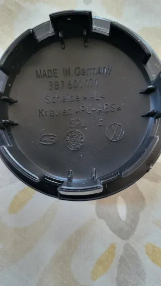 Juego de cuatro tapacubos para llantas Volkswagen. Son de color negro y plata, y parecen estar en buen estado. - Medidas: 65mm - Número de parte: 3B7601171 - Fabricados en Alemania