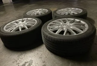 Juego de llantas de aleación para coche. - Diseño multirradio. - Acabado plateado. -poco roce -medida 5x112 de buje -llanta 225x45 r17 Los neumaticos habria que cambiarlos,no vale para nada