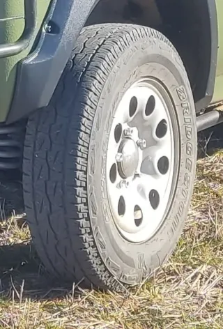Conjunto de neumáticos y llantas. - Neumáticos todoterreno con buen dibujo. - Llantas de aleación plateadas.