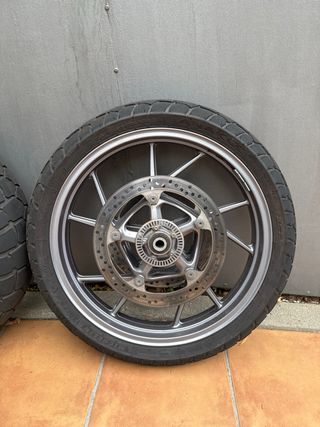 Juego de llantas completas para BMW GS 1200 y 1250. Incluyen discos de freno, disco ABS, sensores de presión y cubiertas a medio uso. -Códigos de los sensores. - Llantas de aleación plateadas. - Neumáticos con dibujo marcado.