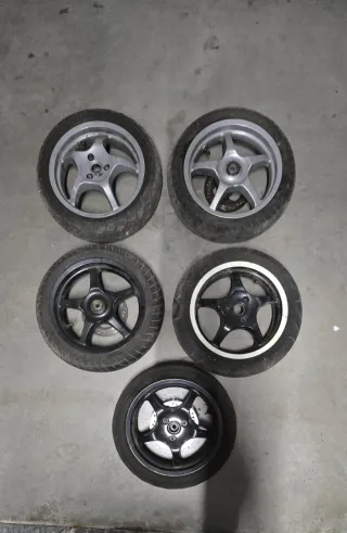 Conjunto de cinco llantas para Aerox. Incluye llantas de diferentes diseños y acabados. - Llantas de aleación plateadas (2).40€ - Llantas negras (2).35€ - Llanta negra con aro blanco (1).15€