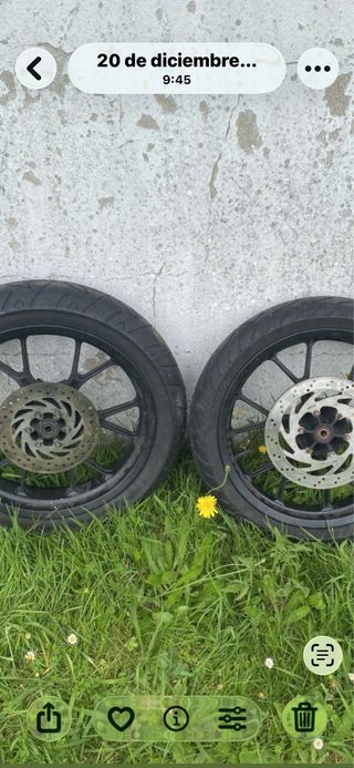 Se venden juego de ruedas para moto, listas para instalar. - Incluye disco de freno. - Llantas negras de aleación.